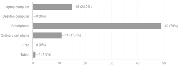Figure 1 shows the type of devices that participants reported to have access to. The percentages in the below graph includes for those who have access to multiple devices; hence, they do not correlate with the total number of the respondents. Some participants own the devices, while others accessed through friends and families.