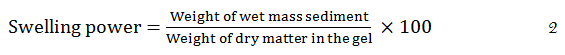 Swelling power and solubility index were determined using the method described by Takahashi and Seib [25]. It involved weighing 1 g of the sample into 50 ml centrifuge tube. 50 ml of distilled water was added and mixed gently. The slurry was heated in a water bath at 80°C for 15 min. During heating, the slurry was stirred gently to prevent clumping of the flour. On completion of15 min, the tube containing the paste was centrifuged at 3000 rpm for 10 minutes. The supernatant was decanted immediately after centrifuging. The weight of the sediment was taken and recorded. The moisture content of the sediments gel was therefore determined to get the dry matter content of the gel using Equation 2 .