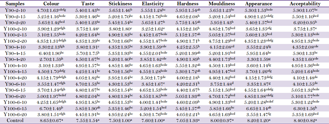]. There was a significant difference in the colour rating of reconstituted IPYFY 6.70 to control 8.65 at p<0.05.This indicates that, the reconstituted control sample has better colour that attract and acceptable to the consumers. Also in taste, stickiness, elasticity, hardness, mouldiness and appearance, reconstituted Control sample was rated significantly higher than reconstituted IPYFY at p<0.05.