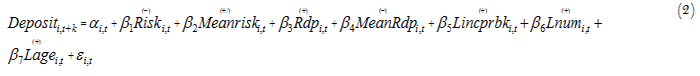 To assess the impact of the risk competition effect on deposit, the average bank risk in the particular area is included in Equation 2. According to economic theory, an increase in the average risk of other banks in the particular area will escalate the supply of deposits to bank i, assuming risk of bank i is constant.