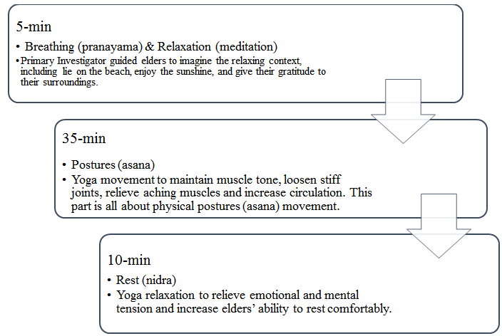 The instructor offered specialized yoga program for retired elderly to the intervention group three times per week, in their dancing rooms. The duration of yoga class is 50-min, as can be seen in Figure 2.