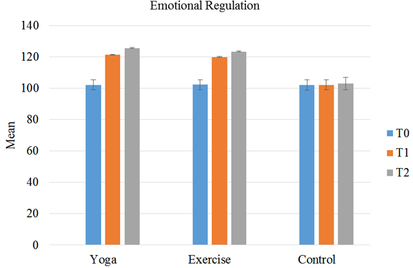 In this research, the result that yoga can improve the higher level of emotional regulation than exercise during the same period from the data. Meanwhile, yoga is significantly higher than the control group in the improvement of the emotional regulation on retired elderly in China. This results in line with other studies which have demonstrated that yoga practicing raises regulatory skills for modulating pessimistic emotion intervention more practically (Khalsa, Hickey-Schultz, Cohen, Steiner, & Cope, 2012; Natalia, Nalu, & Alcyr, 2015