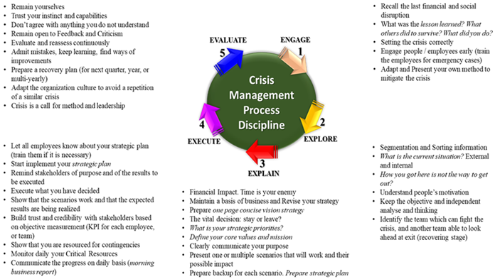 The crisis is not a time for the uninitiated, nor for learning, or reinventing things that should be known. Disaster has many faces; however, they are followed by disruptions and crises. And the financial and social crisis is not behaving differently, they are following the same pattern (Nathanial & Van der Heyden, 2020). We have to learn from the past and be prepared for the present and future. Every organization’s management is better to have a mechanism to assess the risk and respond pro-active in order to avoid a financial disruption or to conquer a social disaster. In this regard, the rule of 5E (Engage, Explore, Explain, Execute, and Evaluate) is better to be verified, adapt, and apply where is appropriate.