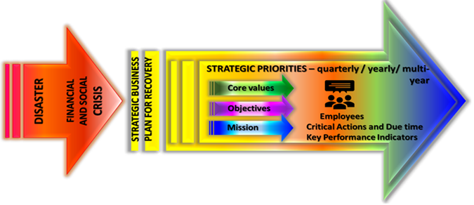 One thing is for sure, disasters and crisis may happen, and it is very difficult to avoid them. We can assess the risk and try to reduce the losses. However, when we talk about a socio-financial crisis, which usually takes time for recuperating, we can prepare a business recovery plan, nevertheless, at the same time, we need to learn to live for a while in this environment’s challenge. Putting business on hold, closing, or staying at home is not a long-run solution, it will really affect the socio-financial situation, at all levels, individual, institutional, governmental. We need to take a step back and assess the situation in a critical way, emphasize the core value, the strategic priorities, and bring together all resources we can rely on, and more importantly, the people. In a period of crisis, time can become everyone’s enemy. Currently, is better to maintain the basis of the business and apply the rule of 5Es, with the accent on strategic priorities and everyone’s involvement through a clear operational plan.