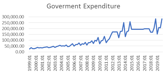 This study uses time series data over the period 1999: 1 to 2019: 4, displayed on quarterly data based on constant values with the base year in 2010, except for data which is in the form of index values. The data sources are Economic and Financial Statistics (SEKI) published by Bank Indonesia (BI), and data from the Central Statistics Agency (BPS). Government spending, i.e. spending on goods and services (government consumption) as a proxy for fiscal policy. Fiscal policy is assumed to focus more on economic growth. The variables adopted from Surjaningsih et al. (2012) are total real government expenditure, total real tax revenue, and the consumer price index. Two variables that are different from Surjaningsih et al. (2012