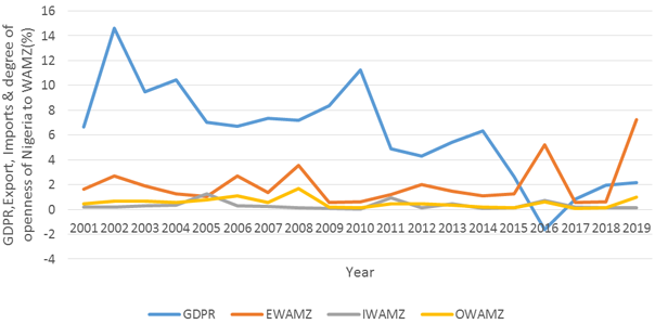 Figure-1. Trend in growth rate of GDP, Nigeria’s exports to WAMZ, Nigeria’s Imports from WAMZ and degree of Openness of Nigeria’s economy to WAMZ 2001 – 2019.
