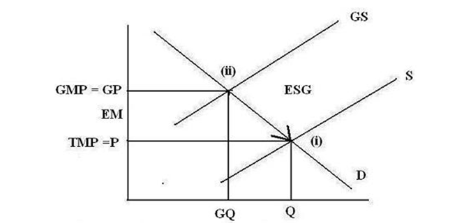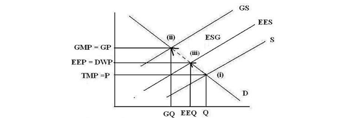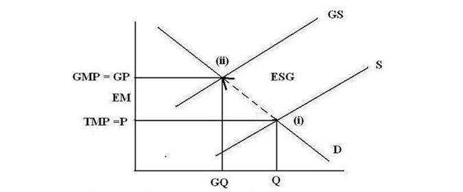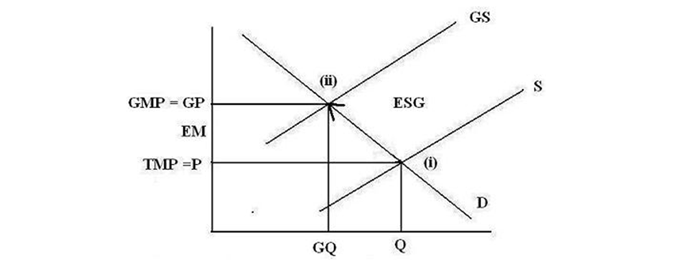 Figure 4 above can be used to highlight the following: a) pricing production at point (i) leaves environmental issues outside the traditional market pricing mechanism created the environmental distortion represented by the broken arrow from point (i) to point (ii) associated with the environmental sustainability gap(ESG); b) if production is priced as at point (ii) there is no environmental distortion and there is not environmental sustainability gap(ESG); and c) production and consumption at point (i) is higher than at point (ii) as the environmental distortion allows the traditional market to produce at lower prices(P < GP).