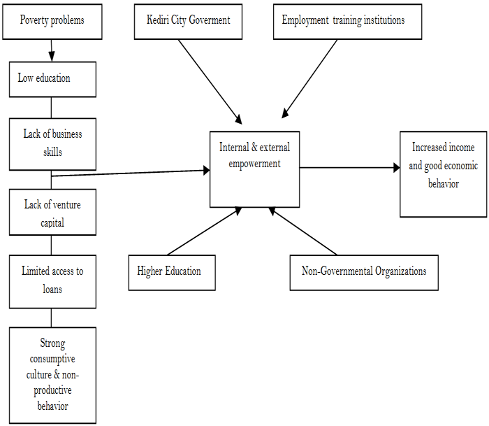 Internal empowerment can be done by increasing the bargaining value (labor wages) by improving the quality of human resources and awareness to limit consumptive and unproductive cultures. Whereas external empowerment can be done by conducting alternative business training (diversification of productive activities) (Aniyati and Alfiah, 2018). The Productive Activities Program conducted by the Regional Government of the City of Kediri is based on three approaches namely; 1) the Community based development approach, 2) the basic approach of the similarity of objectives, activities and domicile areas in the framework of efficiency, effectiveness and social capital growth, and 3) the Joint Business Group (KUBE) approach in managing Productive Economic Enterprises.