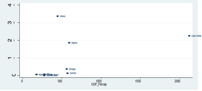 With regard to fixed telephone use, Figure 2 shows for ECOWAS countries, the fixed telephone penetration rate in relation to the level of per capita income. The analysis shows that Cape Verde has the highest penetration rate, unlike Niger and Guinea Bissau and all the other countries in the Community area, which have a relatively low rate. In relation to national income per capita, one can also suspect a positive correlation. Taking the example of Cape Verde, which has a significantly high per capita national income compared to other ECOWAS countries, it is the only country with the highest number of fixed telephone users per 100 inhabitants.