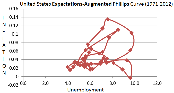 One flaw with the Phillips Curve thinking, addressed in hypothesis number four of this article, is how the curve may “pivot” in its slope, but not shift, if there is a change in productivity, which is related to wages, and other factors such as investment. A second flaw is always assuming increases in demand, rather than decreases, in which case the resulting equilibrium may be lower along the Phillips Curve. Figure 5 was created from unemployment and inflation data from the Bureau of Labor Statistics, assuming that next year’s inflation will be this year’s, but it still does not look amply curvy, convex right. Expectations theory says unemployment is at its “natural rate” when actual inflation equals expected inflation. The second graph is more accurate to theory. The Phillips Curve could change from any of the supply or demand “shifters:” expectations, substitute goods, “acts of God,” import costs, taste and preference changes, or changes in numbers of consumers or suppliers (Arnold, 1998) .