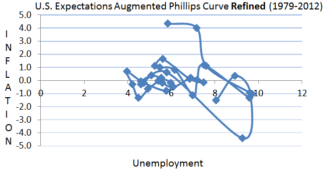 In Figure 5, the author used expected rates of inflation. In Figure 6, entitled “refined,” the author used the difference between actual and expected rates of inflation, which is a more accurate measure of how inflation affects the Phillips Curve. The negative inflation is from low actual inflation. The data for both graphs comes from the Federal Reserve Bank of St. Louis, using average annual unemployment rates, with inflation calculated from the University of Michigan Survey Research Center. Figure 6, highlighted in blue, shows more of an inflation-unemployment tradeoff, although it appears more linear than curvilinear, across several point at a time, because the curve is not shifting, but demand may be moving along a horizontal, long-term supply curve. Wages do not change more than 1%, short-term, settling to the long-term average. Expectations remove the in-between points, yielding a visually smoother, linear, less risky curve.