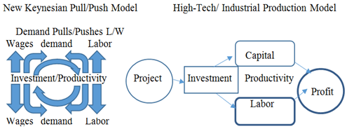 Although the great economist John Maynard Keynes “generally” linked such concepts in his time, this paper puts them together by juxtaposing newer methodologies, namely game theory, and a Phillips curve, overlaying both, and statistically regressing many of such structural variables- numerous conceptual techniques largely unavailable earlier on. The lack of investment stands out as the greatest contributor to lower wages, being susceptible to too many risks. This trend lowers profits and directs resources even more towards capital, not workers. Consumption over housing also factors statistically in volatility, with increasing female employment adding to lower wages. The paper offers several original, conceptual models of consumption and investment, and policies, categorizing how wages and employment are affected, which are corroborated by looking at different periods of history, namely the low-inflation era post-the-Great Recession (2007-2009 technically) versus the opposite, inflationary gaps of the 1970s, using as examples two high-tech, highly illiquid states: the U.S. and Japan.