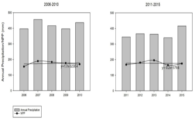 By comparing the annual changes of grassland vegetation NPP during 2006-2010 and 2011-2015, we found that the NPP value fluctuated in this period and was significantly correlated with annual precipitation in this area (correlation coefficient is 0.779). Moreover, NPP value did not increase since 2011 after the ecological rewards allocated to households even showed a downward trend during 2011-2015 (Figure 2).