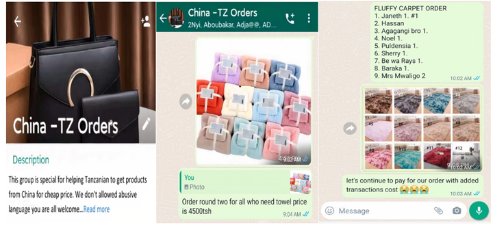 (1) The company finds items online from e-commerce platforms such as Taobao, Pingdoudou, or Alibaba. (2) The company advertises or posts the items’ descriptions and images on WhatsApp Groups (shown in Figure 4). (3) Customers can place an order by sending the item information to the company. (4) The company will process the order by purchasing the item from the supplier. (5) The supplier will process the order and send the item to the company. (6) After checking the quality of the item, the company will send the item to a shipping company. (7) Finally, the shipping company will deliver the item to customers living in African countries.