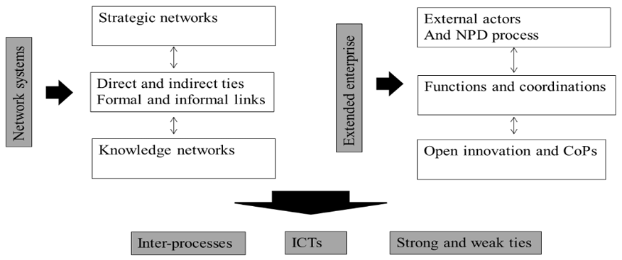 Adopting the open-innovation processes, the EE is extending its collaborations with its partners, suppliers, and customers. Since the innovation happens across the networks of partners, the EE has to scan the environment to identify the most innovative players and set-up the condition to gather their knowledge. Carlsson (2003) argues that using information and communication technologies -ICTs and knowledge management systems in inter-organizational networks is a potential driver of innovation; however, the path-dependencies and mechanisms are the ones influencing the creation of new processes, adopting new technologies or provide new products and services. When the relationships, among firms, are created for the collaboration on innovation –strategic relationships- and knowledge sharing, Passiante, Fayyoumi, Filieri, and Taifi (2007) see that the interdependence and inter-relationship mechanisms occurring are mostly based on inter-organizational communities able to produce new knowledge for the NPD process integration. In fact, many extended enterprise in different in market sectors have reacted to the inter-CoPs concepts; many firms creates inter-organizational communities of practice with different objectives but still focusing on the knowledge sharing and innovation. New knowledge from external actors is a key prerequisite for the development of radical innovation but the understanding of how these are organized and connected with the firm still needs some insights and enhancements.