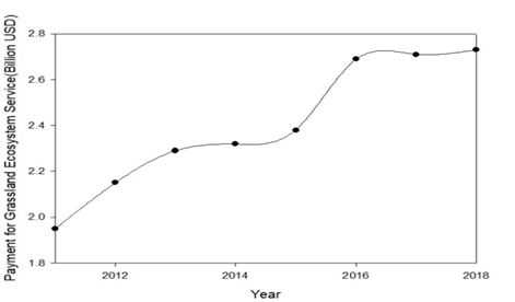 Since 1990s, Chinese government has implemented a series of large-scale ecological projects in order to reduce grassland degradation and poverty in rural and pastoral areas in the western of China. In 2002, the State government issued a document refer to strengthening grassland protection and construction, which indicated the country pay more attention on grassland ecological issues related to natural resource, economic and social development. The document mentioned establishing temporary and permanent grazing ban in grassland areas, gradually changing the extensive grazing mode on grassland, pushing forward intensive way of livestock husbandry, developing high-yield artificial meadow and increasing forage production. “Central government will establish fund for grassland area.” In the same year, the states modified the Grassland Law of China, set up a fund to reduce grazing on grassland and support intensive animal husbandry. In 2003, “Grazing Ban” Project was confirmed. The document of providing fund for fence construction and subsidies for pastoralists in grazing ban area was also published. By the end of 2010, the central government totally invested 1.8 billion USD on “Grazing Ban” Project, built fence on 51.9 million ha of grassland, and provide subsidies for almost 1 million households, more than 4.5 million pastoralists. In 2011, the State decided to change “Grazing Ban” Project into "Grassland Ecological Compensation and Rewards"(GECR) Project. 1.9 billion USD financial fund was provided for grazing ban compensation, livestock number control rewards, the production subsidies and other ecological protection work in 2011, and the investment amount increased year by year (Figure 1). According to the Grassland Law of China, the local grassland management department in county level decide the livestock grazing capacity standard of the grassland, based on the grazing capacity standard of different grassland types, combined with 5 years average yield of natural grassland, artificial meadow and forage land in this area. The livestock number of pastoralists households in county should not exceed the grazing capacity standard.
