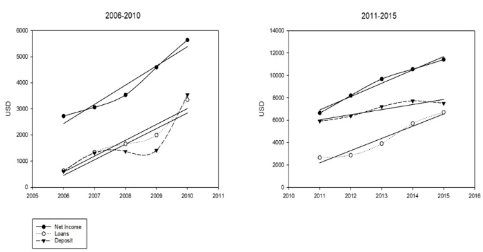 The economic performance of GECR mainly measures whether the policy had an incentive effect on the income of pastoralists. From the annual variation trend of net income per capita, loans and deposits per capita, we found three indicators all showed increasing trend over 10 years before and after the implementation of the GECR, and they all showed a slightly slowed down growth rate from 2011 to 2015 Figure 4.