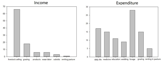 Average household income increased significantly after the pasture and livestock were allocated to households in 1984. The main source of income for all households in the two villages was livestock sale. In 2015, livestock sale income accounted for 67%of the total income in case villages. Other sources of income included renting grazing land and labor, selling livestock products such as milk and wool, government subsidies, and wage work (Figure 5), and ecological subsidies only account for 3% of the total income. 52% of families had less than 50 livestock, and 3 households with no livestock rented out their pasture. Livestock number was limited by the availability of herding labor and financial problems that forced household selling all of their herds. Major household expenditures were living costs (52%), including weddings and medical fees. Production costs accounted for 48% of household expenditures, and livestock costs such as buying forage and renting pasture were significantly greater than agricultural costs (Figure 5).