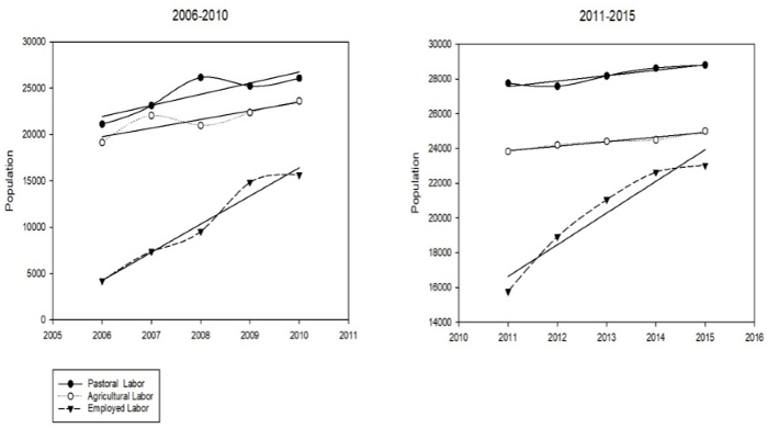 The social performance was mainly used to measure whether the GECR had influence on encouraging pastoralists to change livestock production mode or find alternative livelihoods which led to livestock number reduction on grassland. Results showed that the three indicators all had increasing trend during 2006-2015. The number of pastoral labor and agricultural labor was relatively stable in 10 years, while the number of employed labor grew rapidly Figure 6.