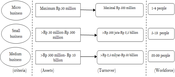 Based on Law No.20 of 2008 concerning UMKM, it consists of; 1) Micro Business is productive business owned by individuals and / or individual business entities that meet the criteria for Micro Business; 2) Small Business is a productive economic business that stands alone, which is carried out by individuals or money business entities that are not subsidiaries or branch companies that are owned, controlled, or become a part of rising directly or indirectly from medium businesses or large businesses that fulfill Small Business criteria; 3) Medium Business is a productive economic business that stands alone, which is carried out by an individual or business entity that is not a subsidiary or branch of a company that is owned, controlled, or becomes a part either directly or indirectly with a small business or large business with an amount of wealth net or annual sales results as provided for in this Act. MSME criteria can be seen in the Figure 1.
