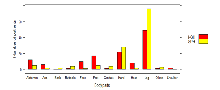 The results of wound etiology of the 128 chronic wounds investigated at NGH showed that 41.41% were acquired through cut, inflammation 27.34%, road traffic accident (RTA) 21.09%, burns 5.47% and surgery 4.69% (Figure 1). On the other hand, out of the 132 patients investigated at the SPH, inflammation was 50%, road traffic accident 12.12%, cut 24.24%, surgery 8.33%, burns 2.27% and other sources 3.03%. Comparing the two facilities, there were significant differences in the cause of wounds (p ˂ 0.004) in all cases. In the investigation into the site of chronic wounds, majority of the wounds 57.57% and 38.28% from SPH and NGH respectively were located on the legs whilst only 1.51% and 4.69 from SPH and NGH respectively were located on the arm (Figure 2).