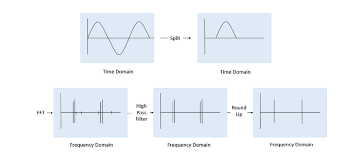 A java library J Transforms is used to do FFT transformation. As the library only uses real part of any signal thus absolute values of complex value of FFT transformed input signal is used. Thus, frequency spectrum is formed. From observation of frequency spectrum some specific frequencies with very amplitude are found. These are referred as peak frequencies.