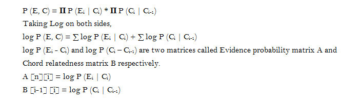The Evidence probability matrix denotes the probability of the evidence occurring given a particular chord is played. The size of this matrix is N * C where N is equal to the number of evidence that is been observed and C is the number of chords in database. From particular evidence it is matched how many notes of that specific chord has match with the evidence and that many points is assigned to that chord. Suppose evidence is C, F, G notes and comparing it with C major chord with is consisted of C, E, G notes. Then there are two notes match between these two. So, two point is assigned to C major. The probability is normalized by dividing a chord’s point by total number of points given to all the chords. Similarly, probability for all the chords are computed and Evidence matrix is filled up. Some chords might have zero notes common with a particular evidence. For that zero probability is assigned.