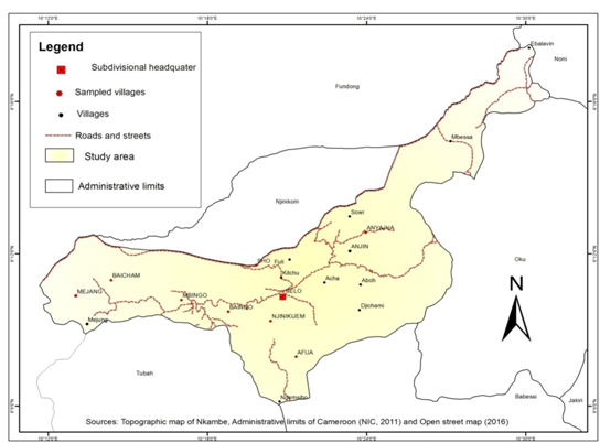 Lower Boyo is a political and administrative delimitation of Belo and partly Njinikom sub divisions, all found in Boyo Division in the Northwest Region of Cameroon, located about 50 km away from Bamenda city-the regional headquarters of the North West Region of Cameroon. It is located between latitude 6000 to 60 201 north and between longitude 100 111 and 100 301 East of the Greenwich Meridian Figure 1. The entire Sub Division covers a surface area of over 46,068 square kilometres and a population of over 40,757 inhabitants unevenly distributed in the nineteen villages [11] . Given the growth rate of 2.6% per annum, the current population figures stand at about 88,664 persons [12