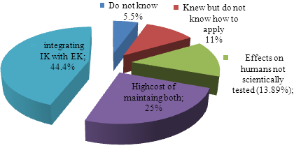 In the study area, IKs and EKs of shelf-life extension are varied and many and equally varies with the types of food crops preserved and the seasons. The harvesting season corresponds with the period of high rainfall which renders yields preservation and storage against rodents, mold and weevils very difficult for the peasant farmers. In responds to this, farmers have resort to the integration of IKs and Eks in order to extend the shelf-life of food crops preservation and storage. The varied IKs and integration methods in study area was practice as per household and not as a community. The integration of these IKs and EKs have proven to be very effective as about 44.4% of the households were found integrating IKs with EKs. In this case, it is strongly recommended that a participatory approach should be encouraged when it concern the use of IKs and EKs to enhance the shelf-life of foodstuffs. We equally supplements that the above IKs strategies though having its own weaknesses are an integral part of the rural society and should be harness and modify, and integrated into modern scientific knowledge by extension worker inorder to improve on post harvest management of food crops [13] . With the most use IKs and EKs integration here being ikaɳ and insecticidal plants when integrated with vetiver roots, repelled or kill weevils. Others such as the integration for the prevention of mould and rodents should equally be encouraged. In this case, the farmers are part of the problem and should equally be part of the solution.