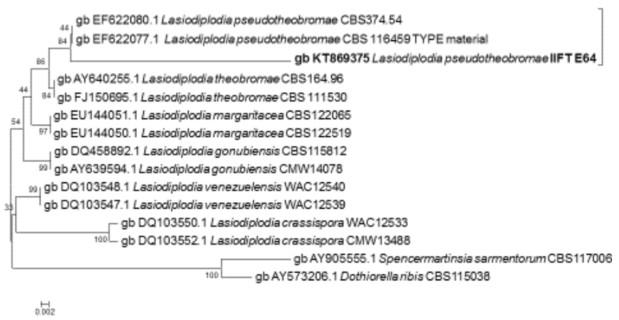 In the Figure 1, comparative analysis using BLAST-N confirmed that the isolated species (IIFT E64) belonged to the genus Lasiodiplodia with 99-97% identity with isolates of L. theobromae and L. pseudotheobromae. The clade grouping the L. pseudotheobromae strains was very robust according to resampling values 84 and included the gb EF622077.1 sequence corresponding to the type material for this species.