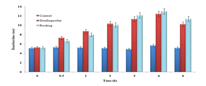 Experimental animals were divided into three groups of six each. Group I received sodium carboxy methylcellulose (0.5%), group II and III received dexibupropen (100 mg/kg) and prodrug 100 mg/kg respectively. Prior to administration, the volume of right hind paw edema of each animal was measured by digital plethysmometer. After 30 min of dosing, carrageenan (0.1 ml, 1% w/v, phlogistic agent) was injected into the planter surface of right hind paw. Right hind paw volume of animals was measured at 0.5, 1, 2, 3 and 4 h intervals. Mean volume differentials were calculated to assess the anti-inflammatory potentials of dexibuprofen conjugate (Vandana et al., 2014 ).
