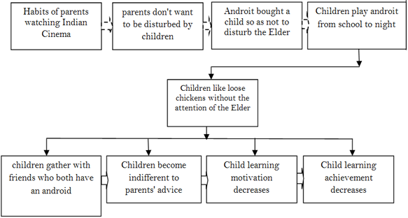 Awareness of parents about children's education is very low. Indian films on TV are always watched by parents, from morning to night showing that parents do not care about children's education at all. The habit of parents watching Indian movies on TV does not want to be bothered by children at all, so children are bought by HP (androit). Finally the children played cellphones from school until they left for school. The condition is allowed by parents, because parents do not care about children's education at all, and parents do not want to be bothered by children at all. Children are like loose chickens. Parents always meet in front of the house and in the neighbors. Father works and takes a nap. Children are left to play, and parents do not care about all the children's learning needs at home. Finally, the child does not care about the advice of parents. All parental advice is ignored by children Figure 1. The child becomes out of control, like a chicken that escapes from its cage.