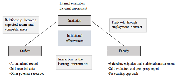 Three entities’ weighted score model for institutional performance. From the above discussion, this study proposed the conceptual model of data inflow for better institutional effectiveness in terms of certain evaluation standard Figure 1. Based on the three entities (institution, student, faculty), the proposed model suggests how each stakeholder generates representative data in a certain way and how the relationship between entities has through their property. The rationale behind this mainly comes from the individual growing perspectives and planning through a college education. A goal of one entity may collaborate with others’ intention and on the other hand, when they face on certain challenges, they can consider under contracts between them or cognitive buffering by themselves. While the relationship between individual and organization such as student-institution is more likely to be sustainable under clarified document or contract, the relationship between individuals more depends on the invisible components, such as attitude, perspective, and satisfaction. The big data support the importance of tricky invisible data collection and enforces the traditional role of existing performance indicators for three entities. When the researcher considers the triangle relationship between entities, one of the important things is to be careful the interpretation of representative measurement score. The reciprocal interaction between two stakeholders mainly for the indicators of both contractors, not the third party’s behavior. However, the interactions on campus are not isolated and may have multiple relevances with another measurement. In addition, one positive growth for an entity does not guarantee the entire level of the weighted score and may go through a complex process of investigation for ripple effect under big data adoption. The weighted score in entities indicated the comprehensive mean of each relevant behavioral information for institutional effectiveness and the complicated analysis and new methodologies are required to interpret it.