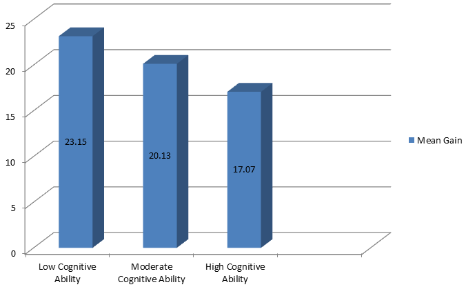 ). The finding of this study was that there was a difference in the mean gain of students with low, moderate and high cognitive ability exposed to CATP. The result indicated that students of low cognitive ability exposed to CATP gained more than those in the other groups. It was found in this study that the low and moderate cognitive ability group benefited more than the high cognitive ability group. This could be as a result of the fact that students with high cognitive ability are already intelligent so that programme might not be all that beneficial to them but might be more beneficial to the low and moderate cognitive ability students because, it uplifted their cognitive ability by improving their mental imagery, thinking reasoning, problem-solving and general mental development which is the hall mark of cognitive acceleration training programme (CATP). Thus the increase in performance could be a result of the interactive and exciting nature of the programme. Although the difference in the achievement of low moderate and high cognitive ability students is not significant the low students tend to benefit more hence it has increased their thinking capability from what it used to be. The finding of this study is in line with Chandler and Sweller (2012