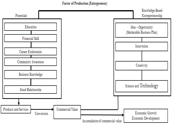 In the Figure 2 the knowledge base entrepreneur with the aid of the learning acquired, in which the potentials are the underlying factors, Convert products and services into commercial value. The accumulation of the commercial value will be the driven force behind innovation, economic growth and economic development. No singular potential could increase entrepreneurial skills fully. Rather, a combination of all will see to the success of entrepreneurs. i.e they are mutually exclusive.