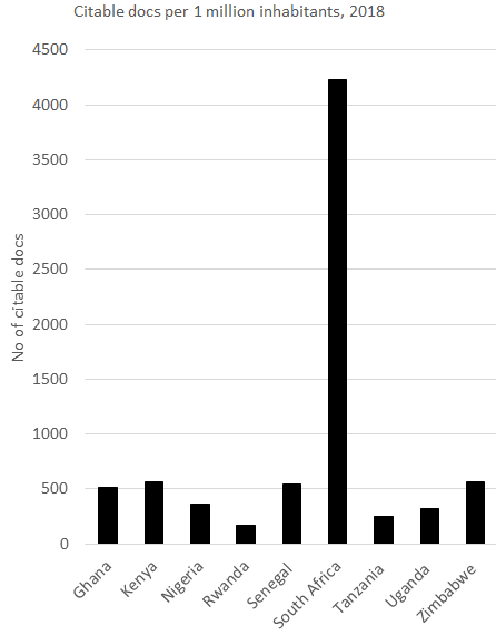 The position of Nigeria in Table 1 among the countries selected based on the research output is unfortunate as a giant of Africa. The H-Index of Kenya and South Africa was higher than that of Nigeria in 2018. However, this paper does not have the output of 2019 to know the current position. The quality of publications from Nigerian tertiary institutions is equally a concern that speaks volumes about our research output. Figure 1 shows that Nigeria is behind Ghana, Kenya, Senegal, South Africa, and Zimbabwe in Citable publications per 1 Million inhabitants in 2018. It might not be a surprise, as it has been observed that most Nigerian scholars have challenges in writing internationally acceptable grant proposals (Baro et al., 2017). These challenges have a critical impact on the sustainability of the country.