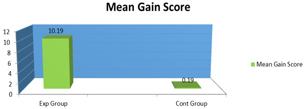The obtained t-ratio value (8.91) has been found to be significant and thus the frame hypothesis is accepted thus there is significant effect of counselling sessions on students’ achievement in English. The comparative view on gain scores in achievement in experimental and control group is thus presented below in Figure 1.