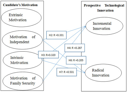 There is low positive correlation between the candidates who possess family security and incremental innovation, and none correlation between motivation and radical innovation. The candidate tends to pursue good family conditions. Caring about the future of their families and members is very important to them. It shows family security is normally pursues steady and obtain a stable revenues. They need innovation to change their future. However, they don’t like to reform their innovation radically. Contrasting with radical innovation, they think the incremental innovation is steady and safety.