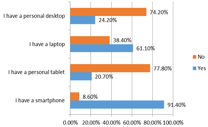 The study found that the majority of the students in the Institute under study had access to technological devices necessary for users to access the LMS. Most students owned handheld devices such as smartphones compared to desktop computers. This finding is consistent with the earlier finding by Kee and Samsudin (2014) who established that students preferred handled devices to desktop computers because handheld devices were easy to carry and to use. However, the study also found that even though students possessed handled devices, they were most smartphones and very few students had personal tablets. This finding is consistent with the finding by Patel et al. (2017