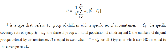 As used by Abras et al. (2013) in this paper, we use the Human Opportunity Index (HOI) framework. Developed by the World Bank's research group, this index is used as an intuitive measure of a society's efforts to equitably provide opportunities for all children. It is constructed by aggregating coverage rates according to life circumstance characteristics into a scalar measure. Formally, the measure of HOI (H) for a given opportunity is represented by the average access coverage rate