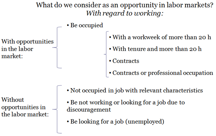 The definitions of the concept of labor market opportunities are based on a trade-off between (i) the availability of information in surveys and (ii) the relevance of a result described by the worker for the concept of opportunity. These definitions take into account all adults aged 18 to 64 in the labor market. An individual in the labor force is characterized as having an opportunity when: he / she has a job (with a defined set of characteristics such as 20 hours of work per week, tenure or contracts) and does not have job-related shocks in the past year.
