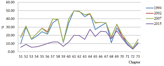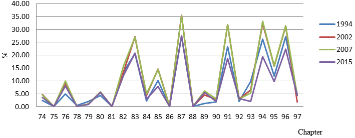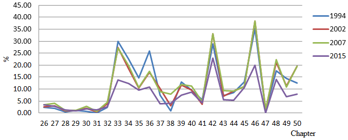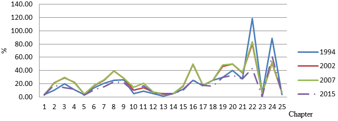 Figures 1-4, respectively, reflect adjustments in tariff rates for Chapters 1-25, 26-50, 51-70, and 71-97. The tariff rates for each chapter are determined by summing up the tariff rates of all goods at the level of 6-digit divided by the total number of products in that Chapter. Between 2002 and 2007, the tariff rates were the same in levels. One interesting point is that the Vietnam tariff rates imposed in 1994 were similar to or lower than the Vietnam tariff levels levied through the chapters in 2002 and 2007. Nevertheless, the tariff rates were considerably lower compared with 2007 to 2015. Chapters 48-67 in particular, the difference between two years in tariff rates is very high. The tariff rates have decreased significantly since joining WTO. This is one of the major determinants helping to increase the value of imports during this period.