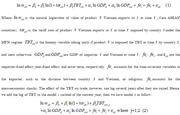 The TBT is a form of technological barriers to trade which importers are increasingly using to protect consumers, the environment. It's also creating trade distortion, though. ASEAN is one of the main markets that imports goods from Vietnam. Under the discriminant treatment, ASEAN members can trade by very low tariff rates for most products. The ASEAN members also implement the NTMs to ensure consumer safety and protect the environment. Here we examine the effect of the TBT raised by ASEAN member on Vietnam trade instead other NTMs. The model is as follow Equation 1: