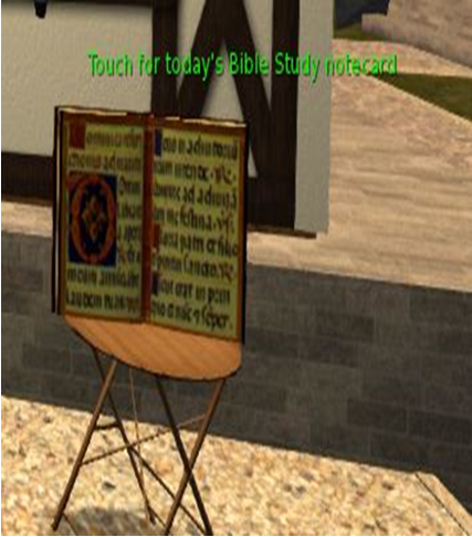 In this context, cultural practices and symbolisms that exist in real life also appear in virtual/potential communities. In Epiphany Island - Home of the Anglican Cathedral in SL there are two regular liturgies, prayers and weekly reading of the Bible. The weekly Bible study is held on a Sunday morning (Second Life Time). It is a regular worship event that is repeated on an annual, calendar basis and is included in the daily worship life of the community. They were held every Sunday in a place called “Enorchestia”, shortly before the Sunday prayer was performed at the community cathedral Figure 2. Attendees, as they enter the community space by touching the Bible Figure 4, which is placed and open on the table, they receive with a notecard the text that they will access and interpret in their weekly meeting.