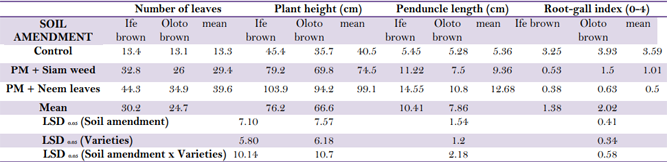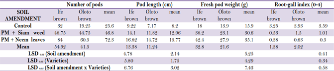 The soil amendment, variety and their interaction showed significant effect on cowpea pod length and root-gall index Table 3. The interaction between control and Oloto brown recorded the shortest and the highest pod length (7.17 cm) and root-gall index (3.93) respectively while longest and the lowest pod length and root-gall index were recorded under the interaction between poultry manure and neem mixture and Ife brown (16.82 cm and 0.38) respectively. The reduced pod lengths obtained from Oloto brown variety on the control plots might be attributed to the severe damage caused by the nematode on their roots which hampered adequate transportation of nutrients by the damaged roots. This result is in line with the reports of Ismail [22