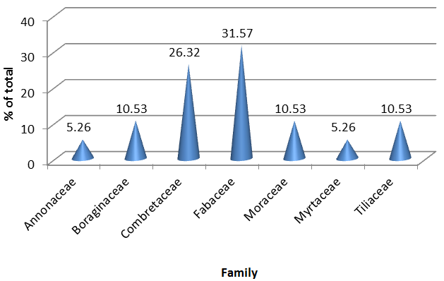 According to Table 2, regardless of their density ha-1, 19 different tree species were identified on the surveyed farm plots Table 2. About 34%, 19% and 49% of the tree species were found in villages of Senne, Fuafate and BHgL respectively. As shown in Table 1, there were also variations in the distribution of tree species among the surveyed villages. The tree species are also grouped under 7 families. According to Figure 2 and 3, these include the family of Annonaceae, Boraginaceae, Combretaceae, Fabaceae, Moraceae, Myrtaceae, and Tiliaceae. The result presented in Table 3 shows that there were 2.68 species ha-1 (STD = 1.86) for the surveyed farms as a whole. According to Table 1, the minimum and maximum number of tree species was 2 and 9 respectively. Similarly, according to Table 5 the average number of tree families was 1.57 ha-1 (STD = 1.42) for the surveyed farm plots.