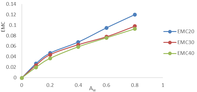 The equilibrium moisture content (EMC) was observed to be increasing with an increase in water activity (aw). This finding agrees with the generally observed trend that the higher the value of aw the more the quantity of adsorbed moisture. This corroborates the observation that at higher aw, more water is available for binding at the active site of the solid. Many researchers have reported isotherms which followed this principle in the literature [15-22] .