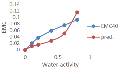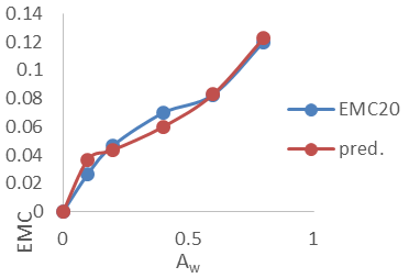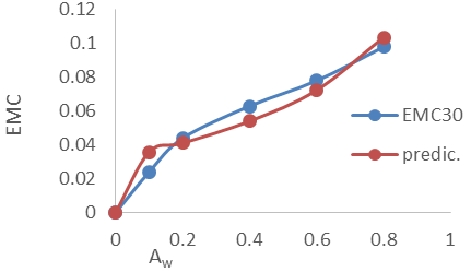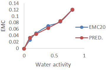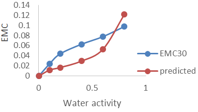 To validate the suitable model, the calculated EMC at different aw determined were used against the predicted at the same aw to plot the adsorption isotherms shown in Figures 2 to 19. The isotherms followed the characteristic type II (sigmoid shape) classification of Brunamer reported by Oyelade [18]. This is typical of isotherms of products high in starch content as observed by Onayemi and Oluwamukomi [23