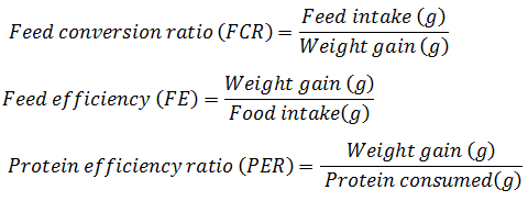 The weight of each rat was recorded at the beginning of the assay, body weight and food intake were measured at regular intervals of every one week during the course of the 28-days feeding period. Feces were not collected for reasons primarily of time, cost and basal diet required. PER was calculated as the weight gain of rat per g protein (%N x 6.25) fed [21-23].