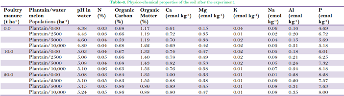 The post-harvest soil chemical properties Table 6 during 2010 - 2011 late cropping season were affected by the amendment of soil with poultry manure. The fertility status after the first ratoon showed significant nutrient loss in unmanured plot. Results showed overall improvement in the soil chemical properties in soils amended with 10 and 20 t ha-1 of poultry manure. Soil pH decreased to 4.38 in unmanured sole plantain plot and increased to 5.20 in plots of plantain intercropped with 10,000 stands ha-1 of watermelon and manured with 20 t ha-1 of poultry manure.
